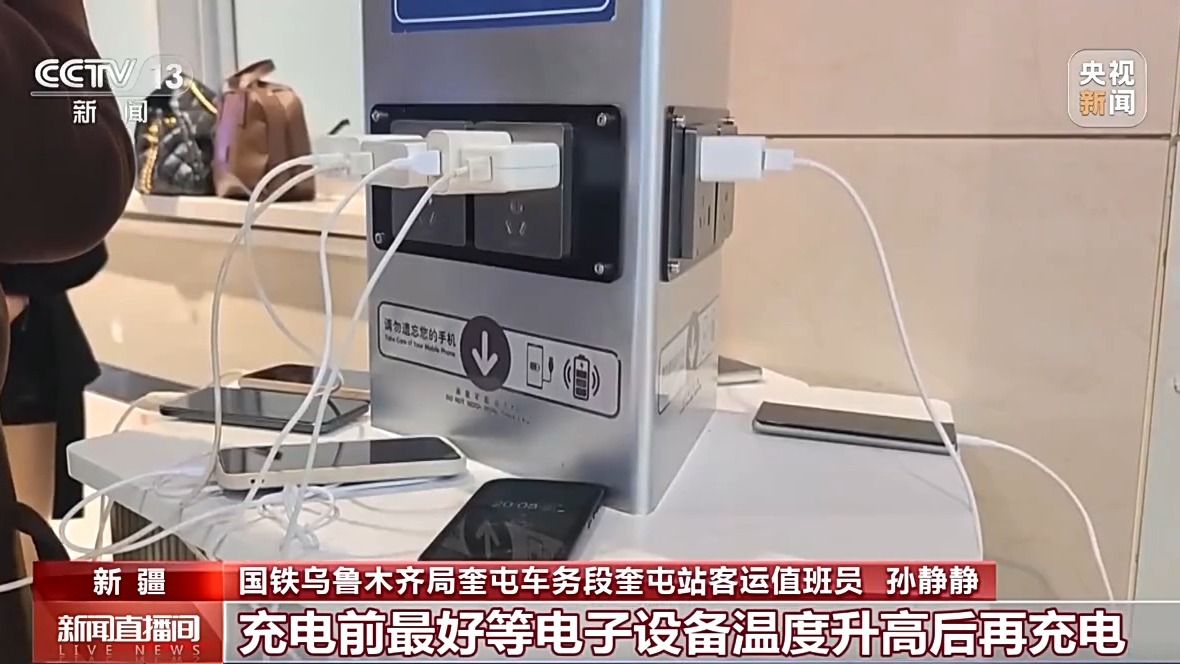 国铁乌鲁木齐局奎屯车务段奎屯站客运值班员 孙静静:特别要注意的是,寒冬天气,手机、相机等电子设备的电池衰减快,甚至关机。建议将设备及充电宝贴身存放,避免长时间裸露影响使用,也可搭配保暖手机壳或粘贴暖贴“保暖”。充电前最好等电子设备温度升高后再充电。